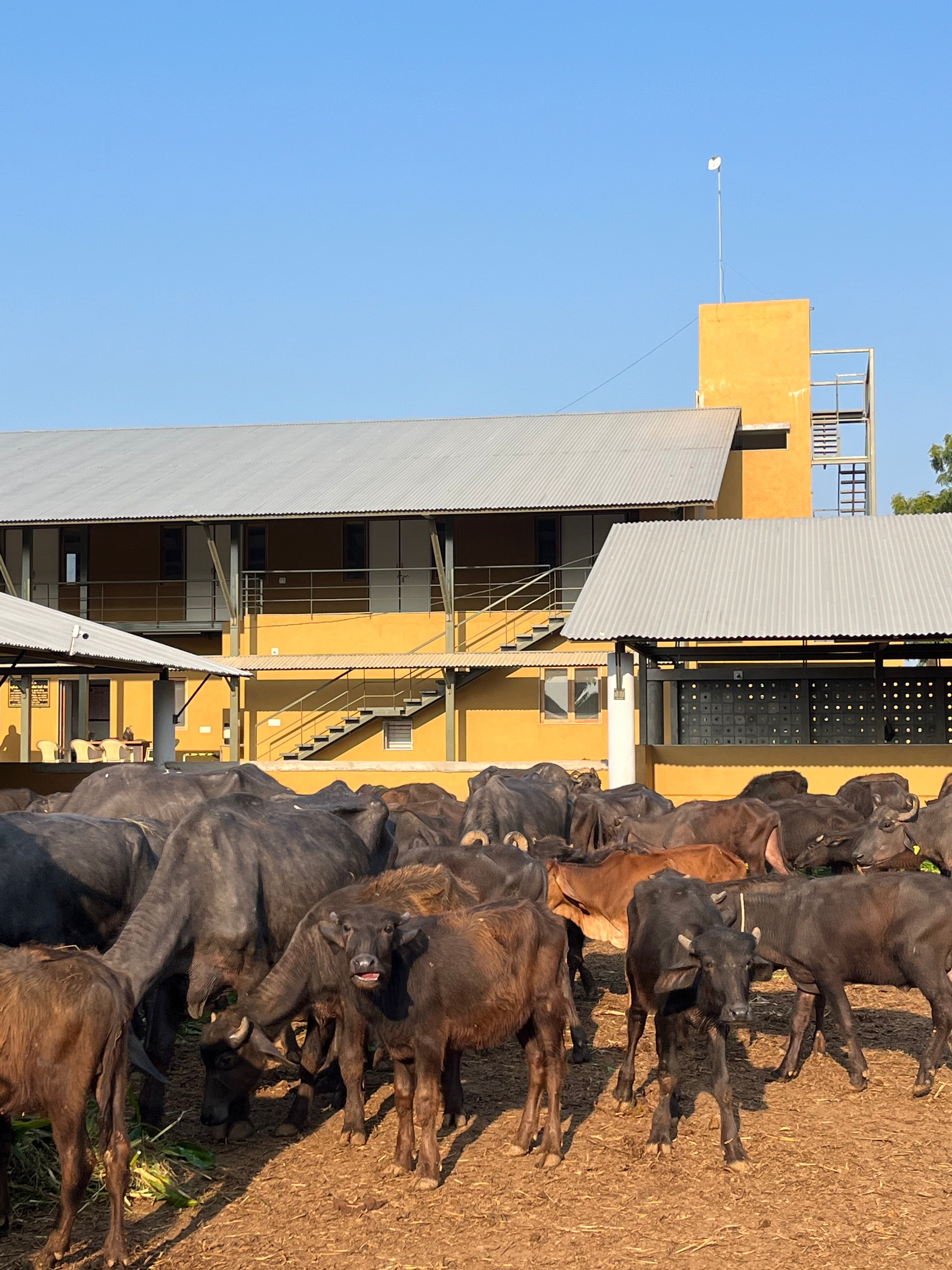 The cattle shelter in Unn, Banaskantha, was established to house 1,500 cattle after a severe flood damaged the previous enclosure. Situated on an agrarian belt near a small village lake, the new site benefits from existing neem trees and local species, which guided the design to maximize natural shade and environmental harmony.