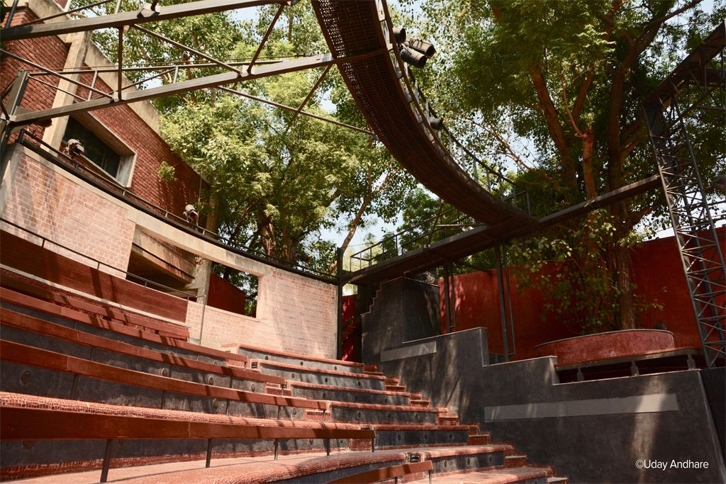 A new open-air amphitheatre re imagines a space for the performing arts at the historic, 70 year old Darpana Academy, on the bank of the Sabarmati river in Ahmedabad