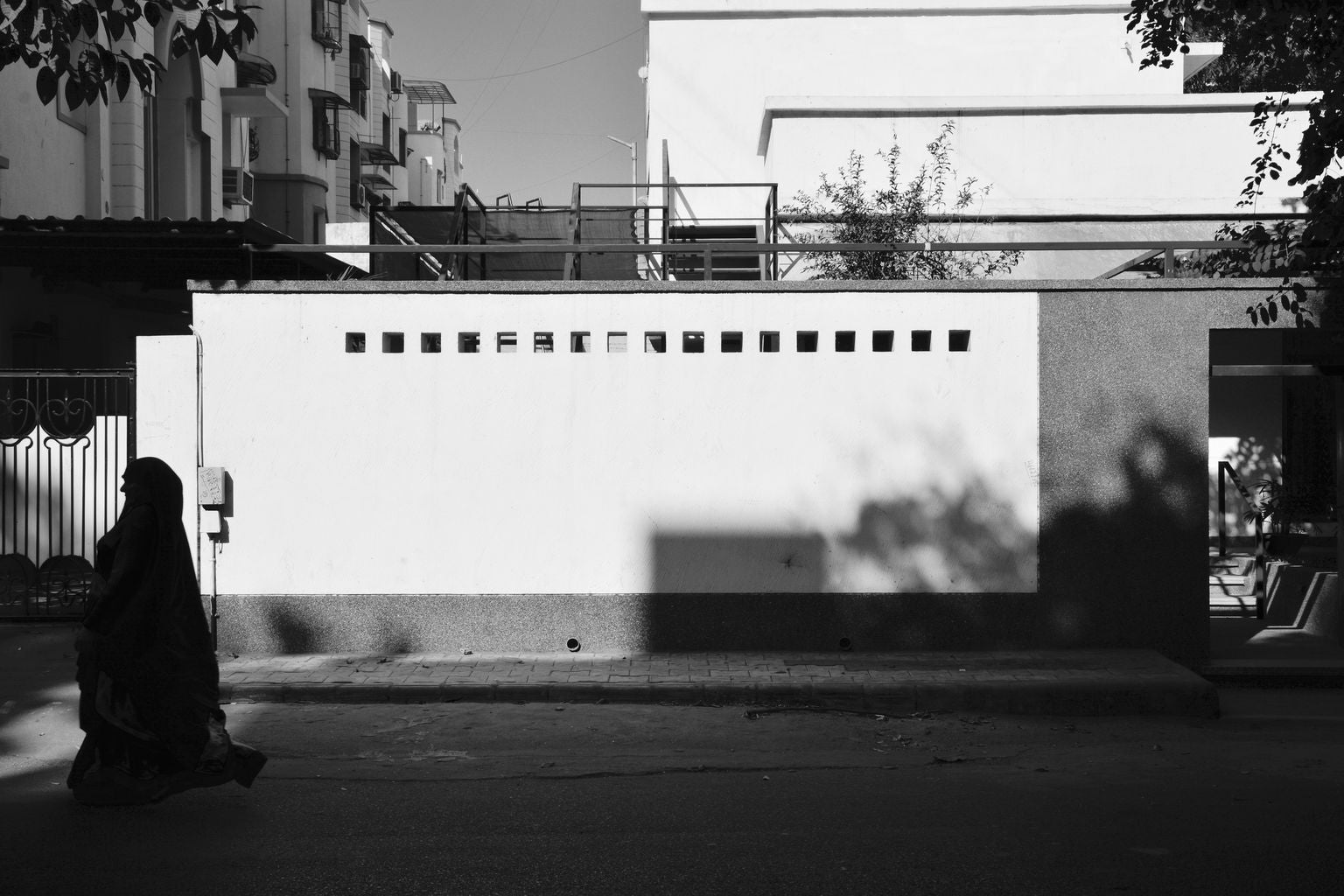 Set within a dense residential neighborhood with apartments all around, this little dwelling could almost be missed. The defining edge along the street is a tall textured wall of white plaster and pebble-crete, punctuated by a singular opening, a tree, and a shop window. This leads into a well scaled green and quiet forecourt.