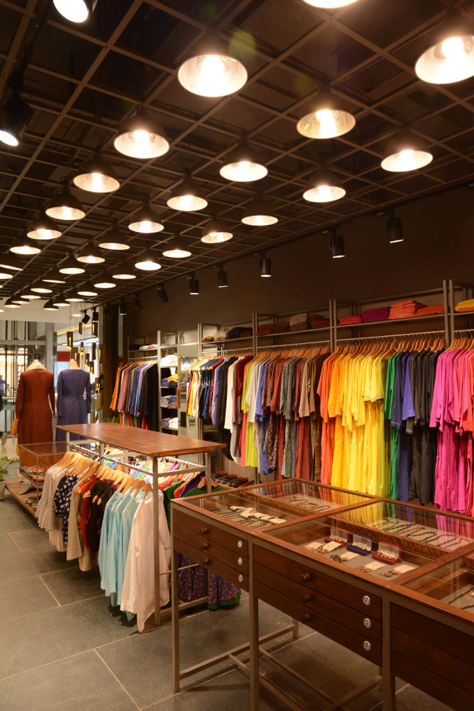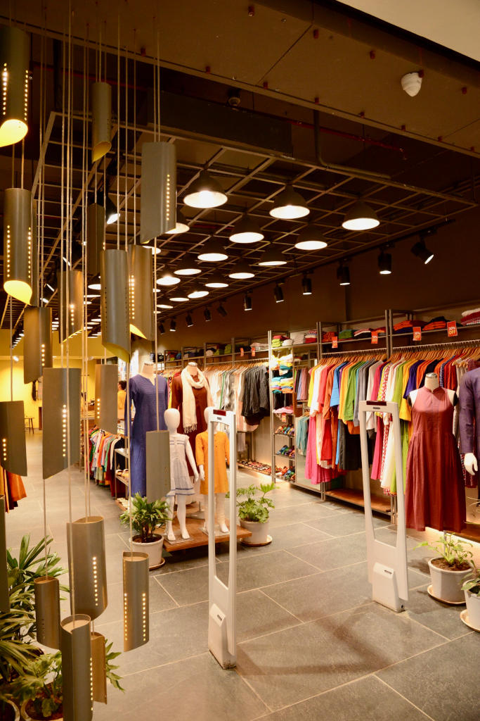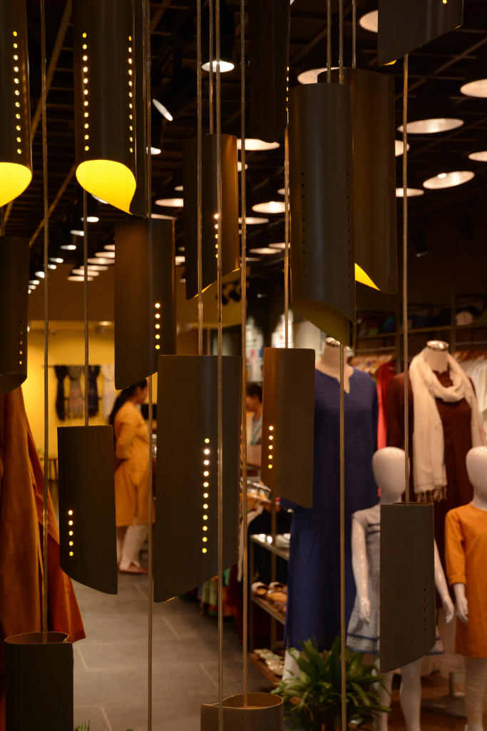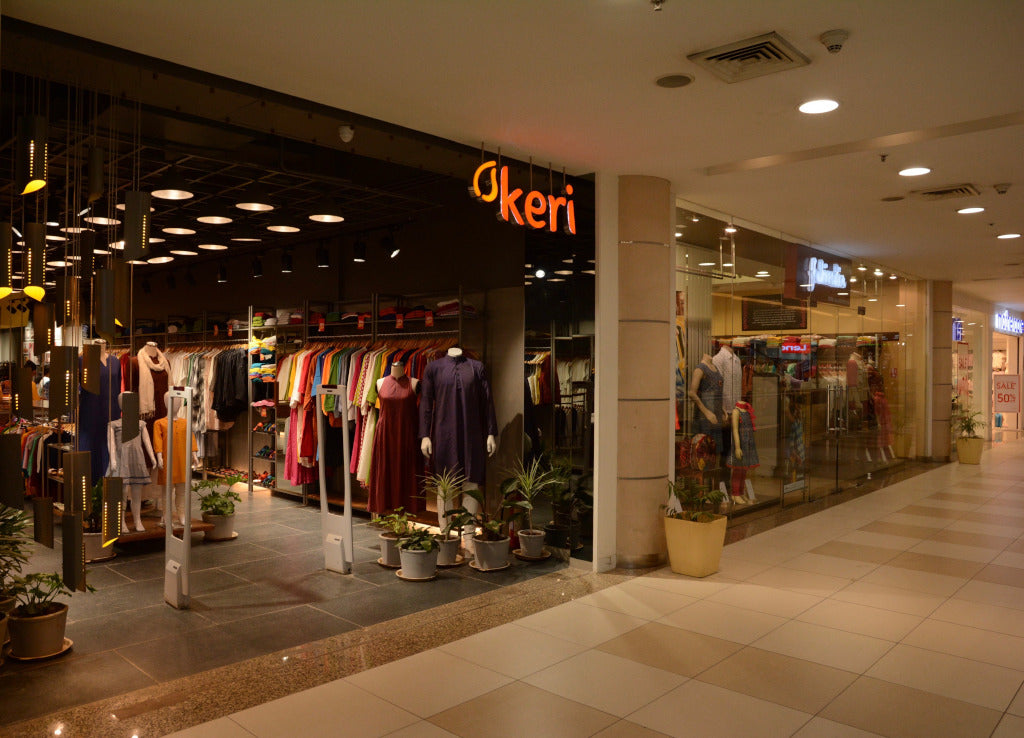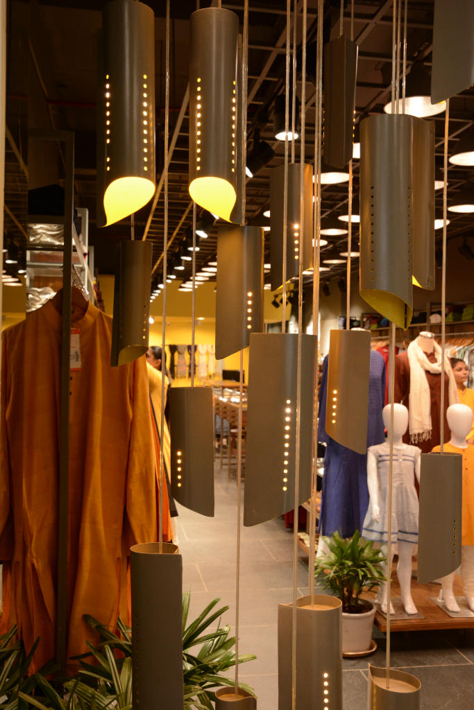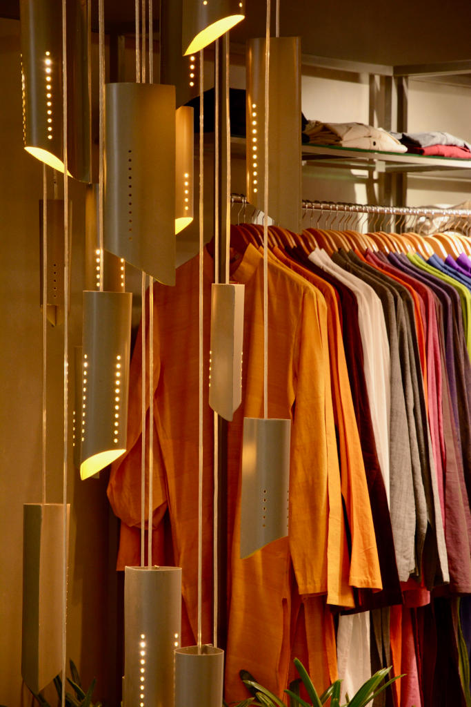 A single narrow volume of space gets defined with light metal racks and an overhead swathe of LED lights to create drama and enhance the visual impact with bright colours of Keri garments. Warm mid gray tones of walls and racks balance with the bright yellow of the receiving wall at the far end of the space. A custom designed light chandelier defines the entry into the space and becomes a visual marker from different levels of the mall space.