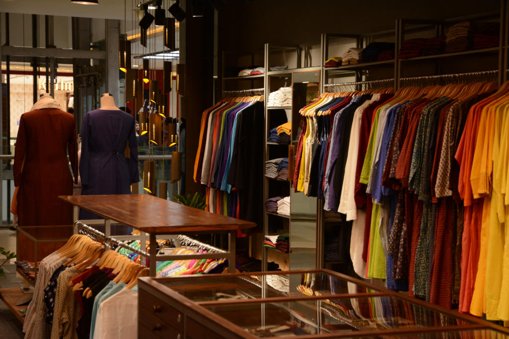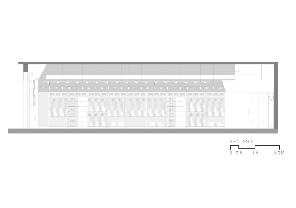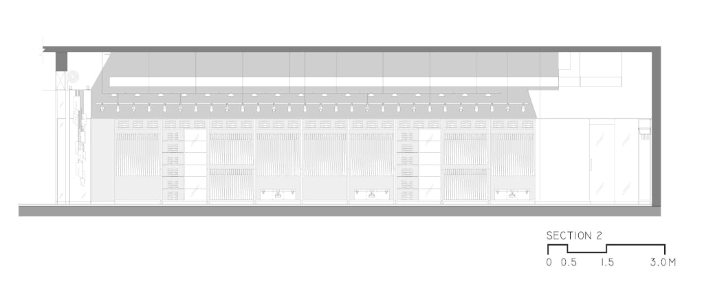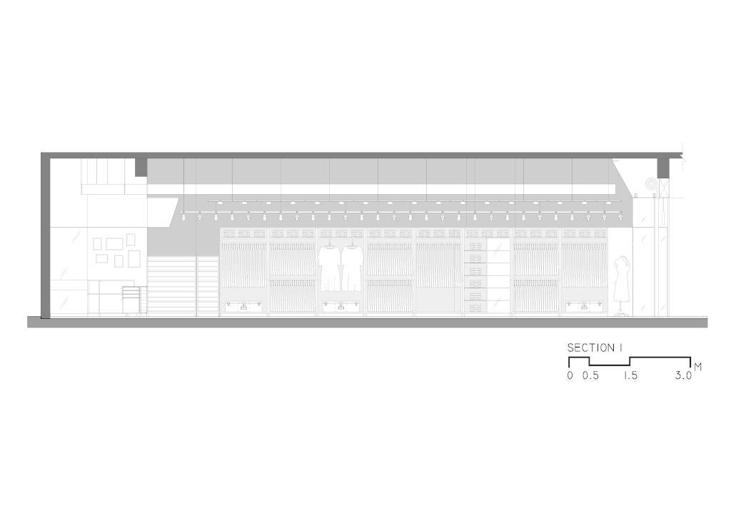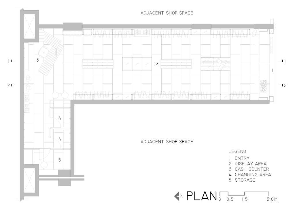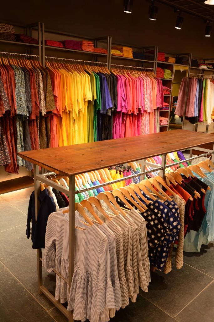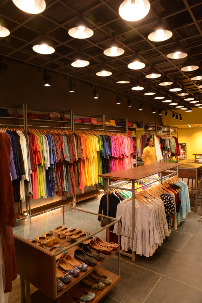 A single narrow volume of space gets defined with light metal racks and an overhead swathe of LED lights to create drama and enhance the visual impact with bright colours of Keri garments. Warm mid gray tones of walls and racks balance with the bright yellow of the receiving wall at the far end of the space. A custom designed light chandelier defines the entry into the space and becomes a visual marker from different levels of the mall space.