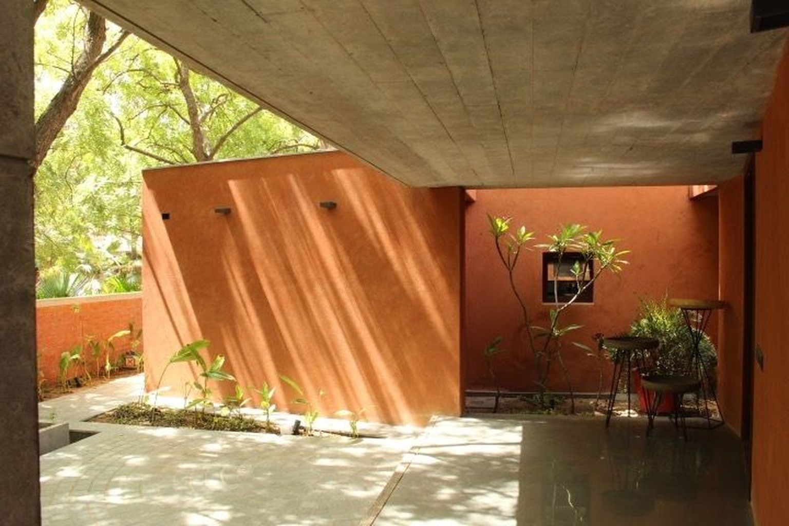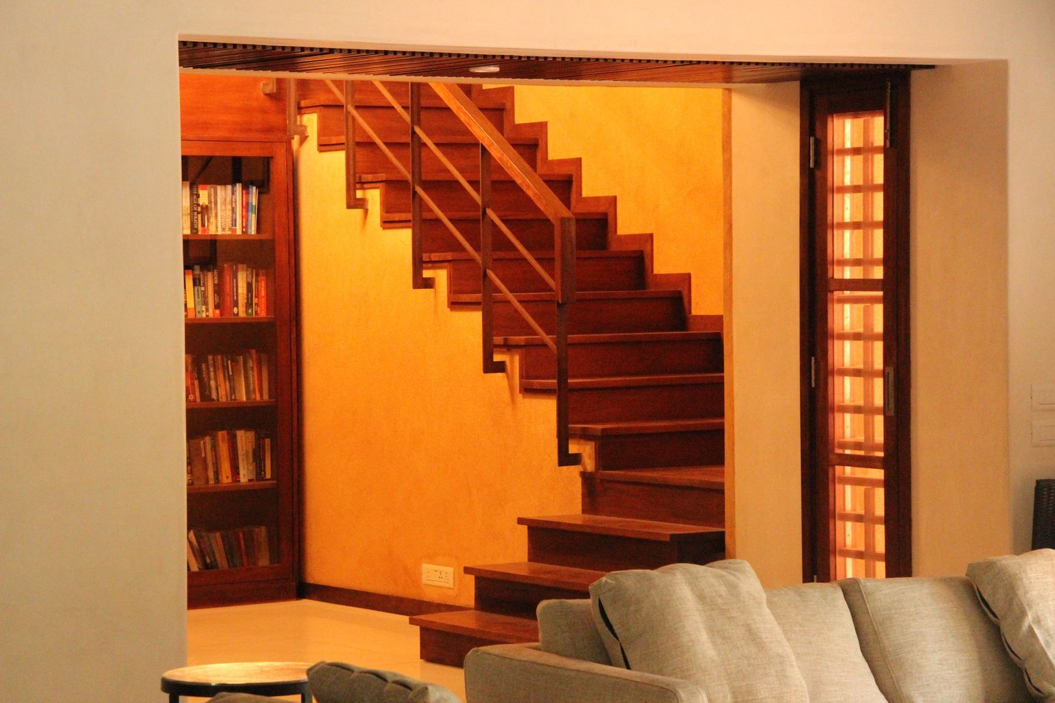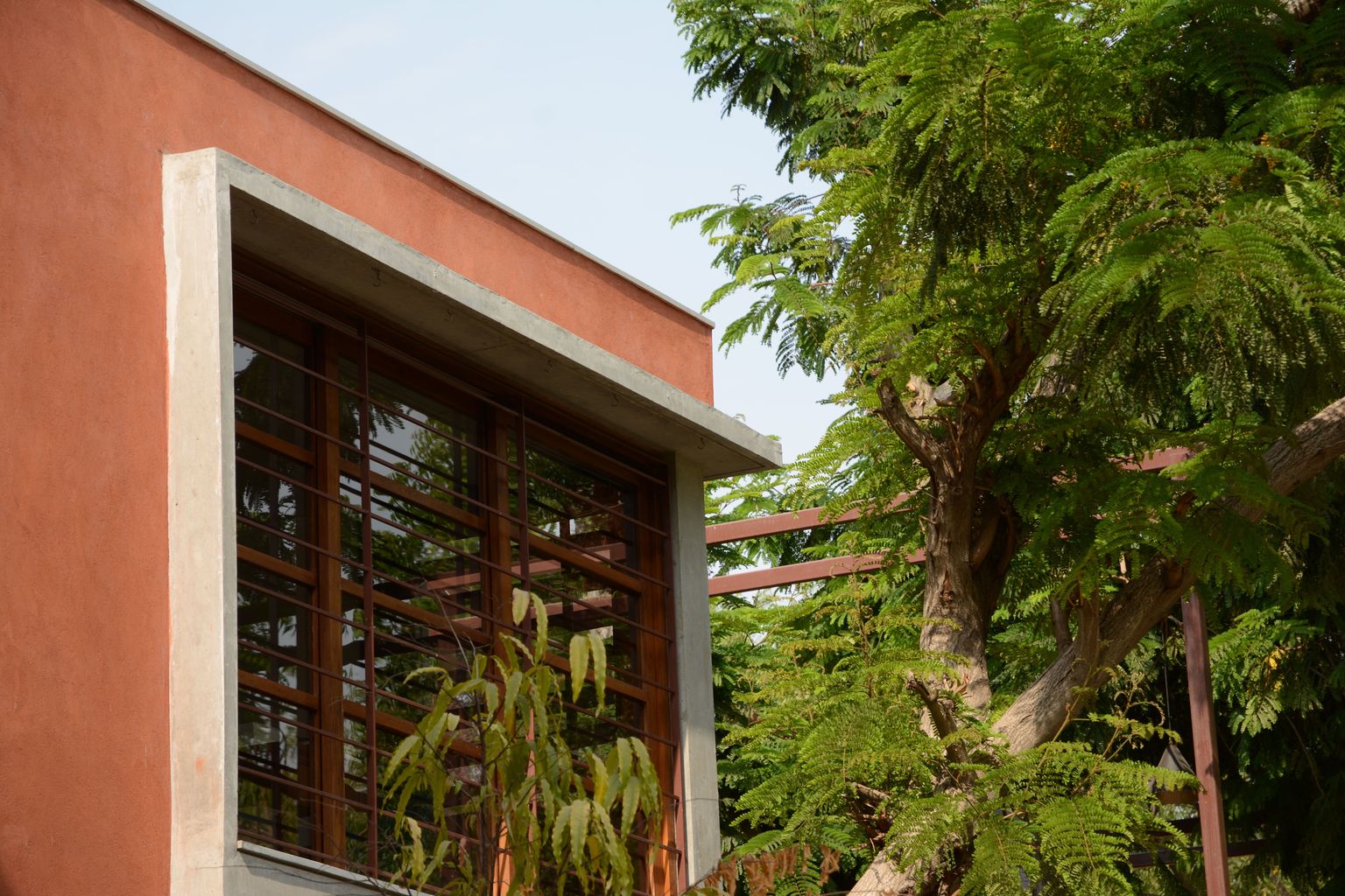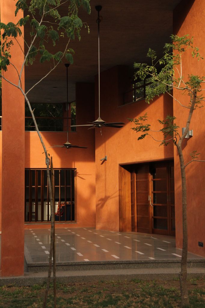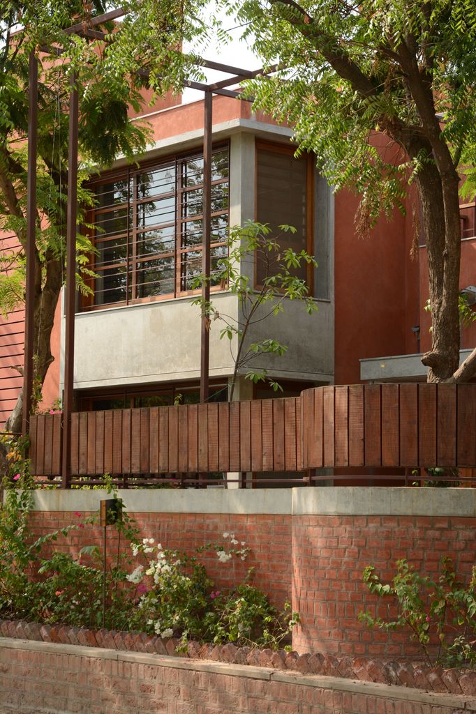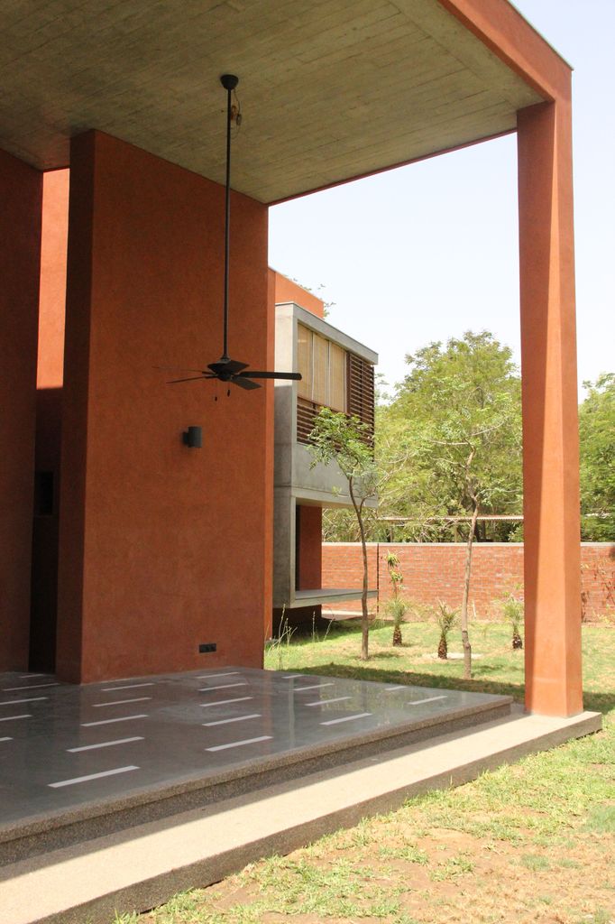 Deriving an expression of its own, it uses the language of bold masonry walls decked with lime and dolomite plasters that lend congruency to its neighbors, amidst prototypical lots of land with homes in exposed brick and concrete. The challenge was to define an identity and address pertinent issues of appropriate materials, thermal comfort and engage with the public edge and land in a meaningful manner.