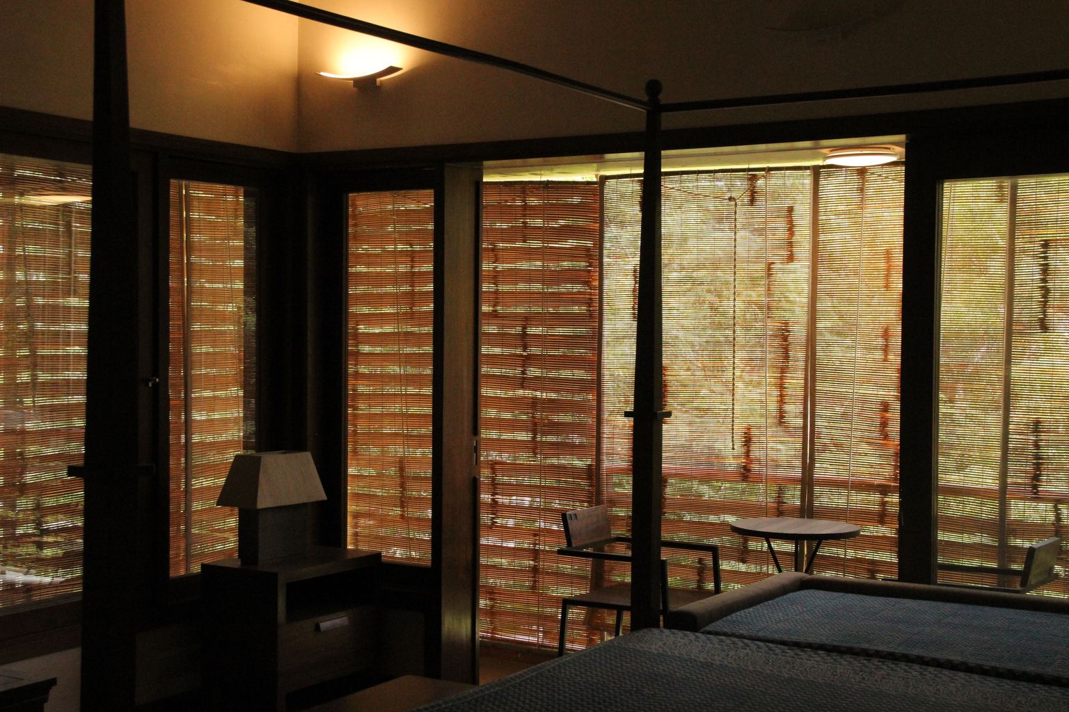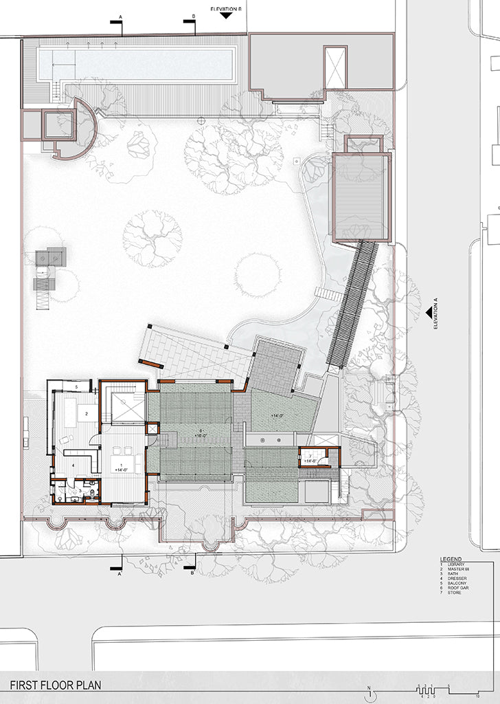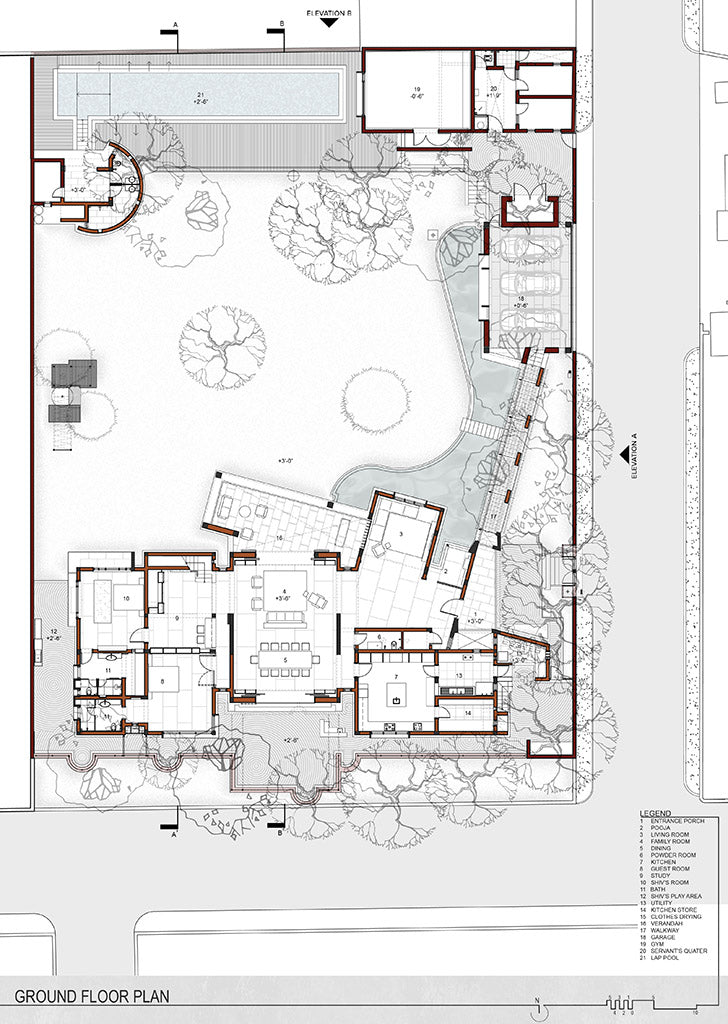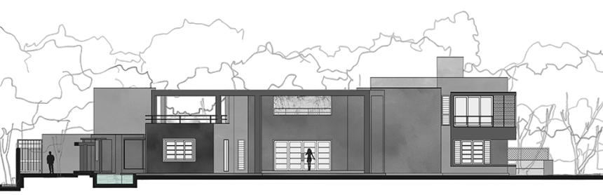 A home for a nuclear family was designed to engage with its many sided vistas and shaded trees.