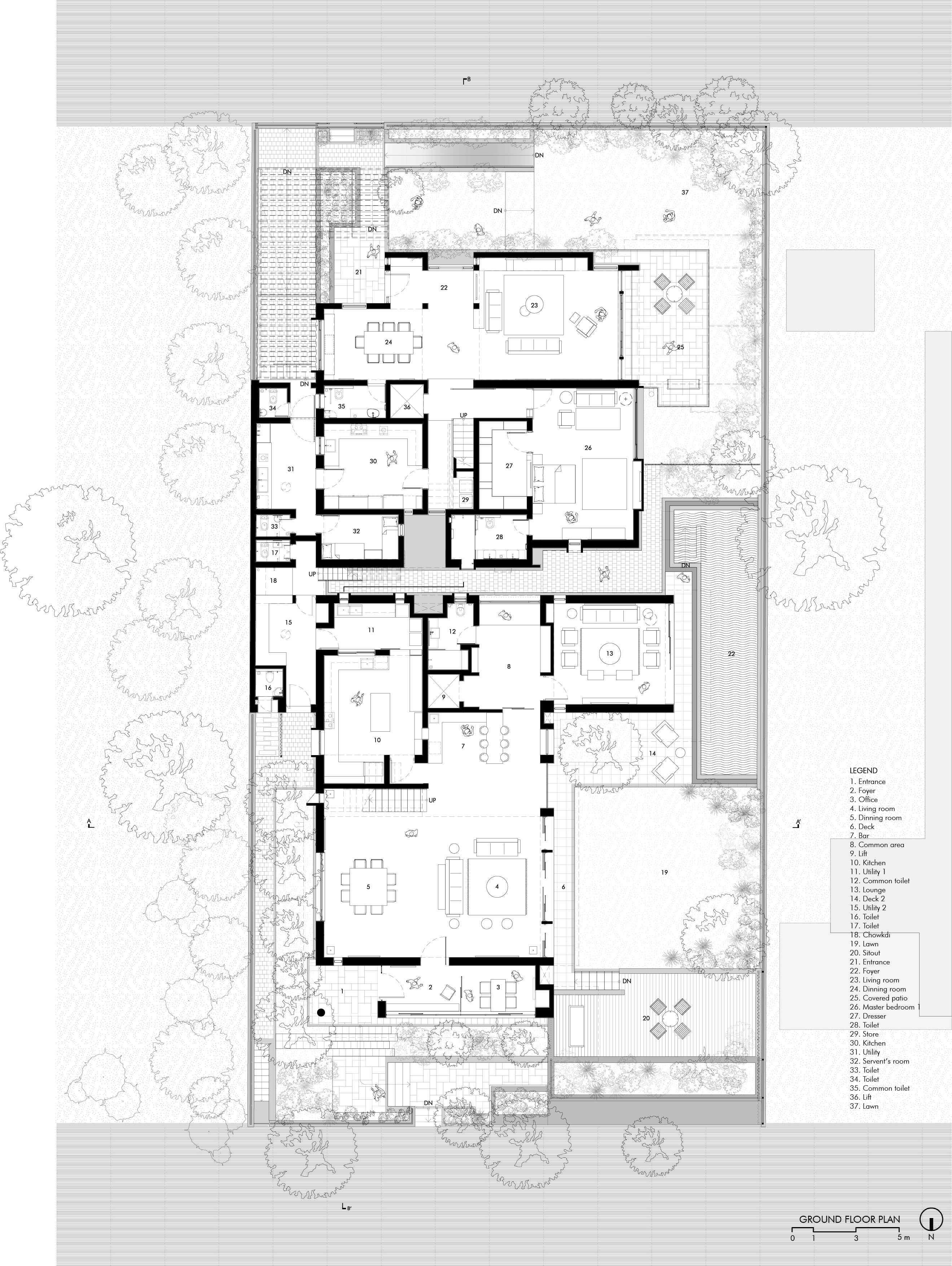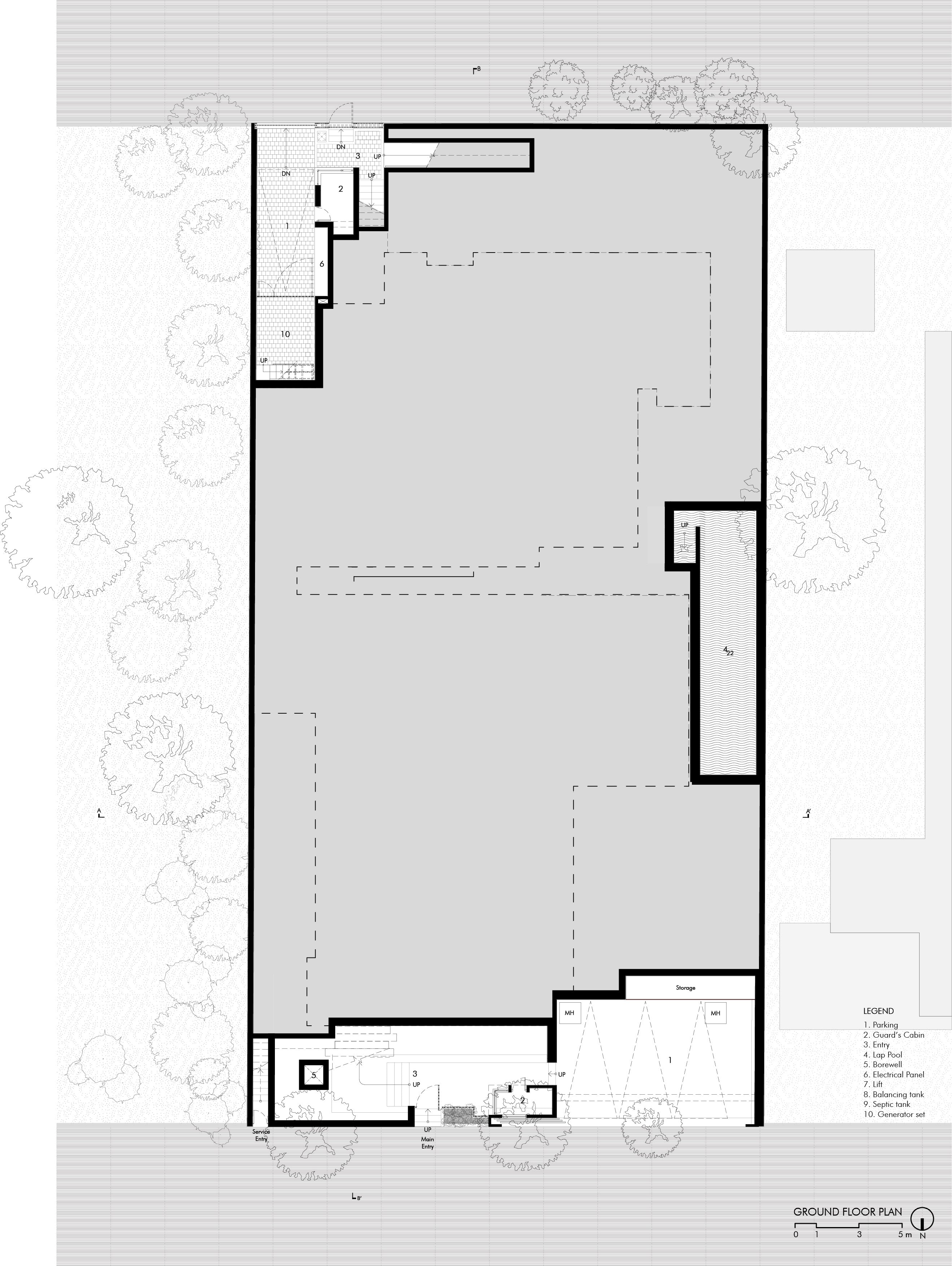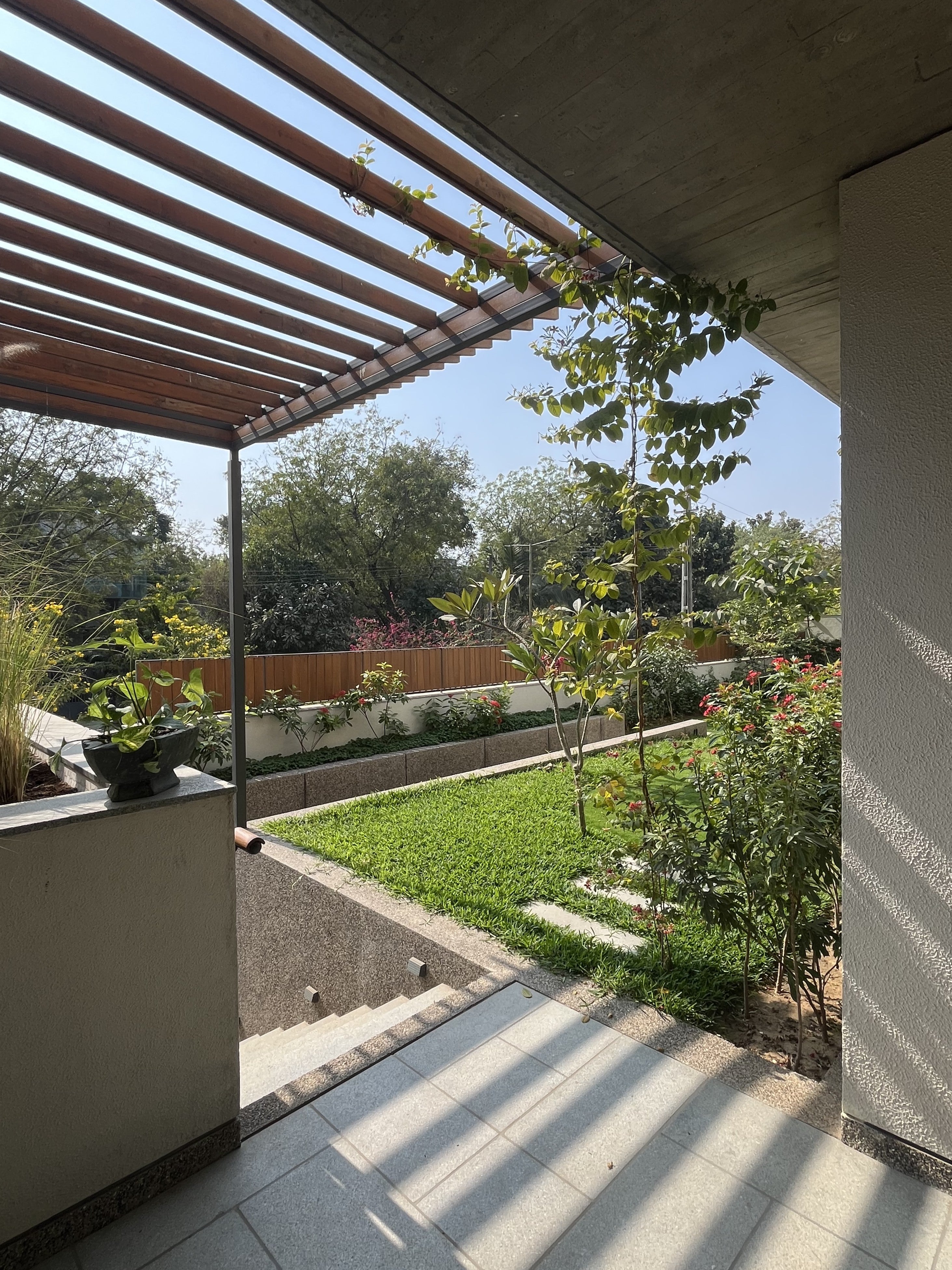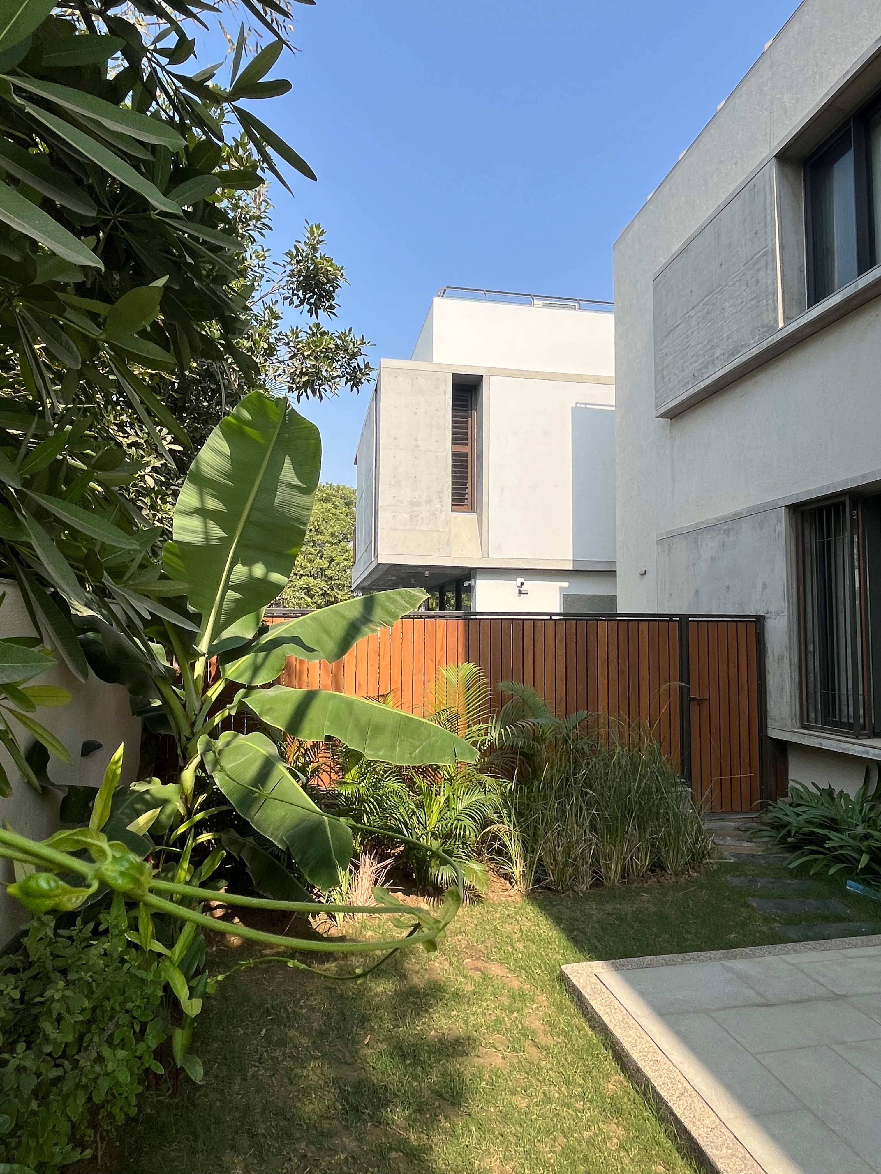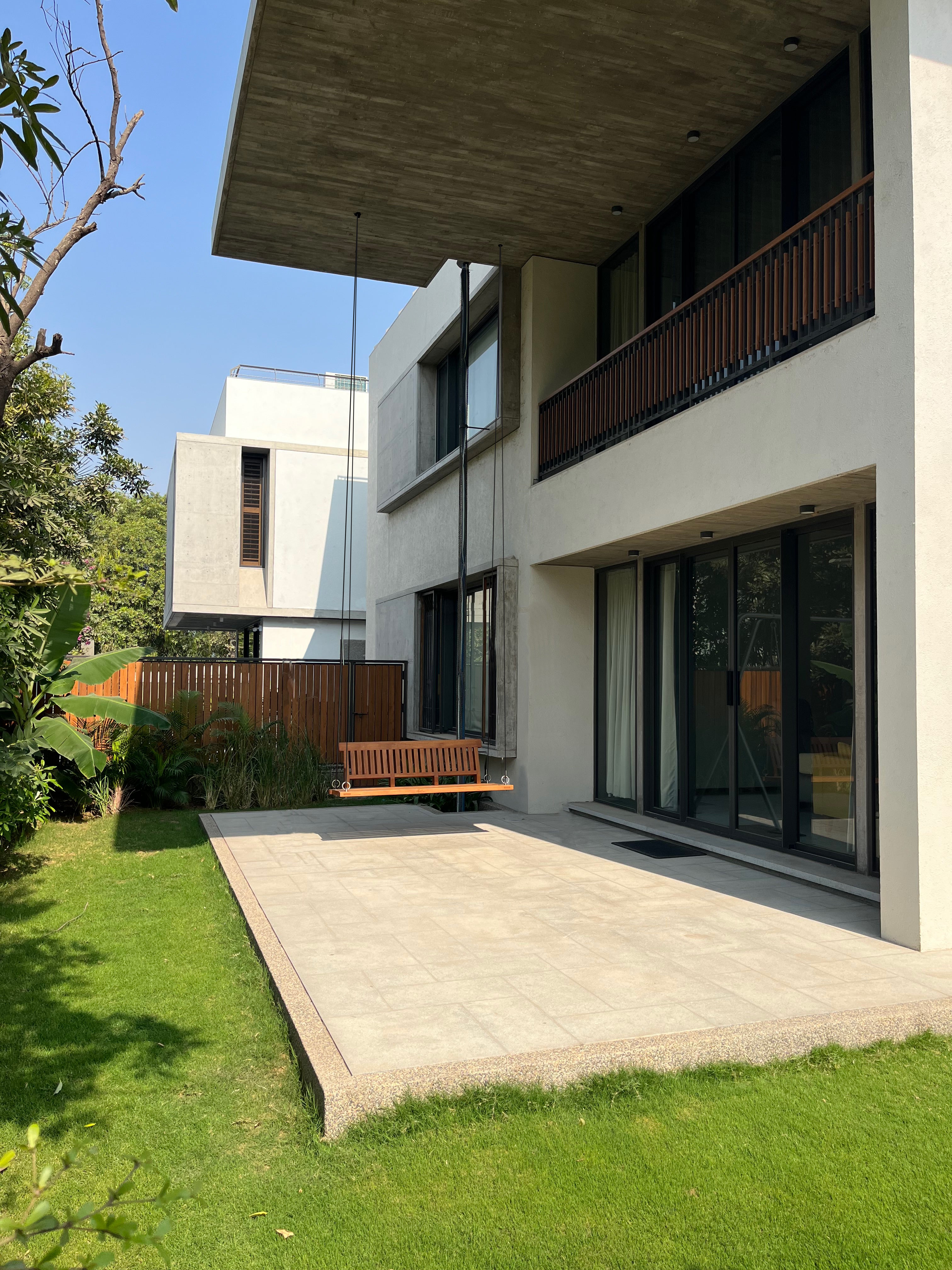 A large urban plot accommodates two independent residences for a semi-joint family across three generations. The seniors occupying the house to the south, the living realms are defined with distinct privacy zones, gardens and social spaces that turn away from each other. A forced dis-association reflected in the plan. However, orientation to the sun and wind flow dictate the architectural strategies for both dwellings. Accessed north-south, the houses are conceptualized as large urban homes with generous proportions of rooms. Continuous living, dining and leisure spaces open towards either the patio or the garden creating seamless extensions along the east-west axis and allowing play of natural light.
