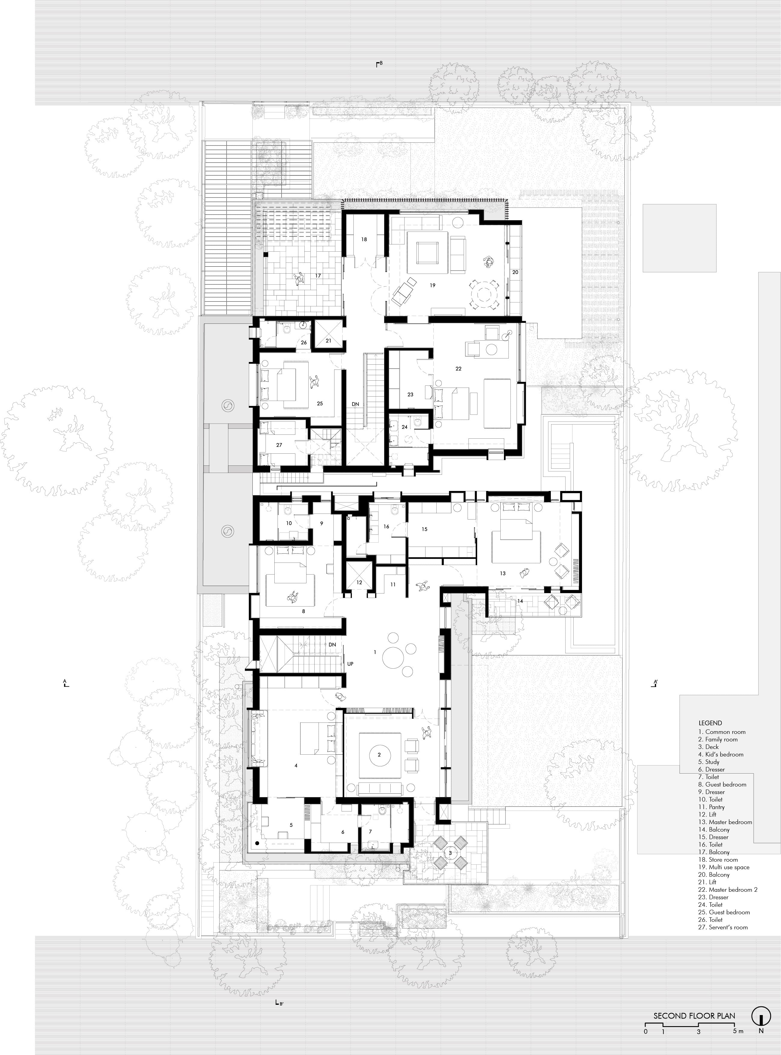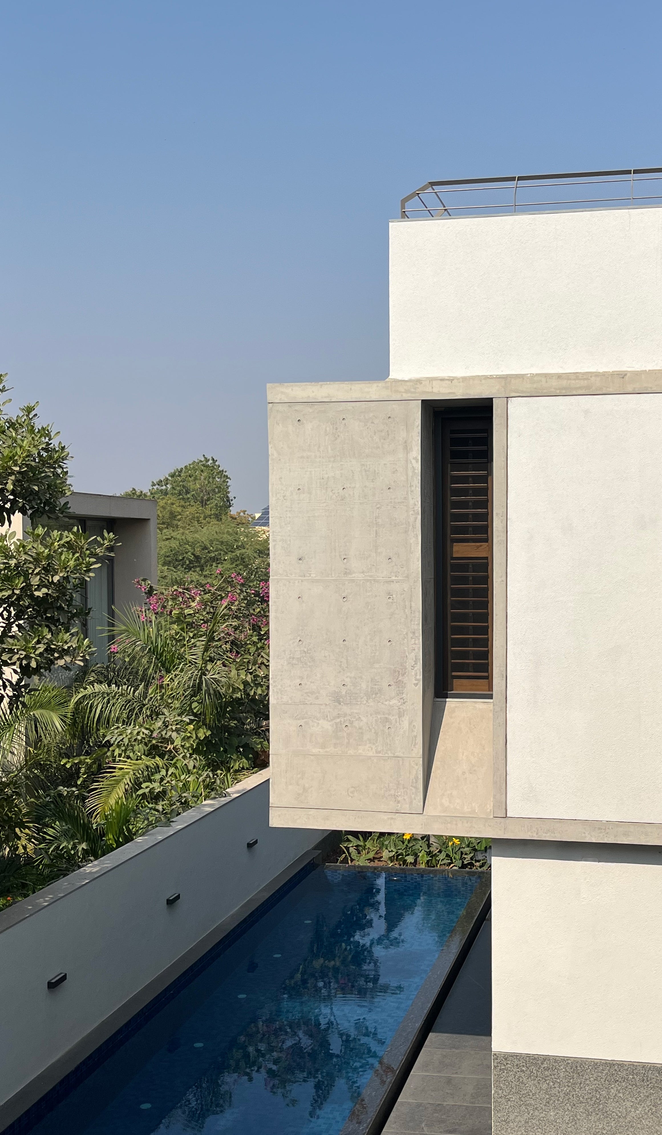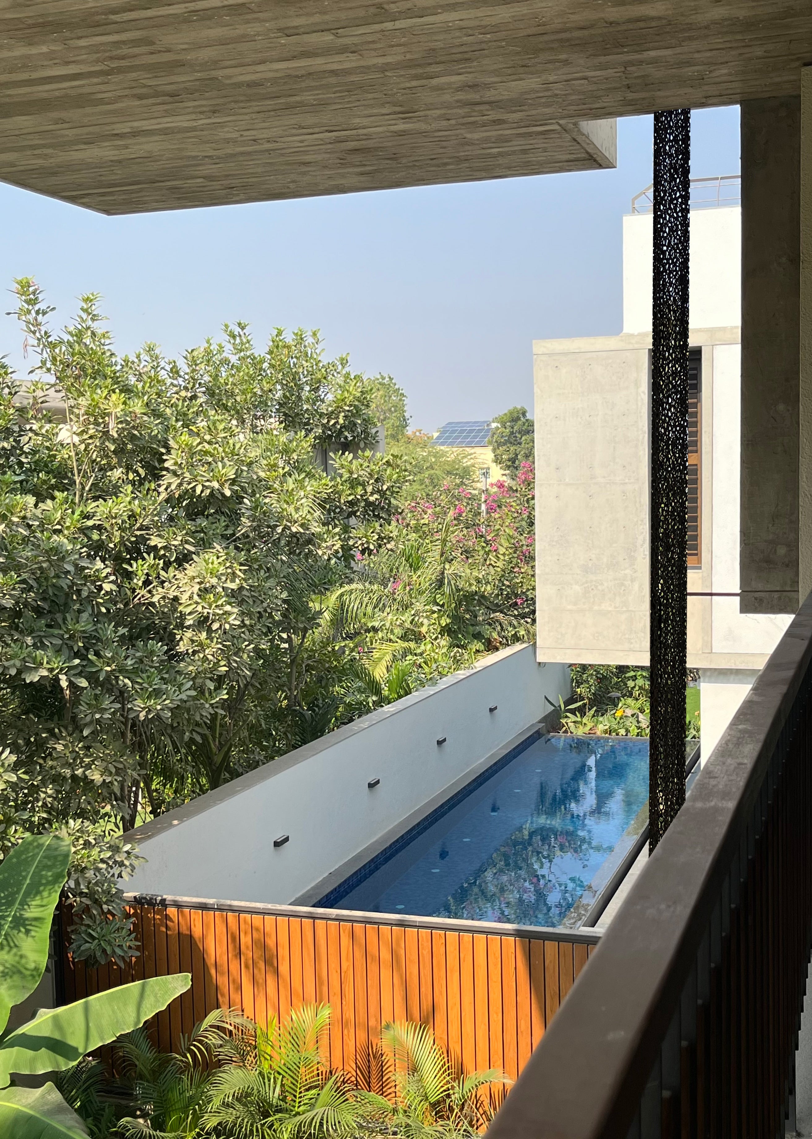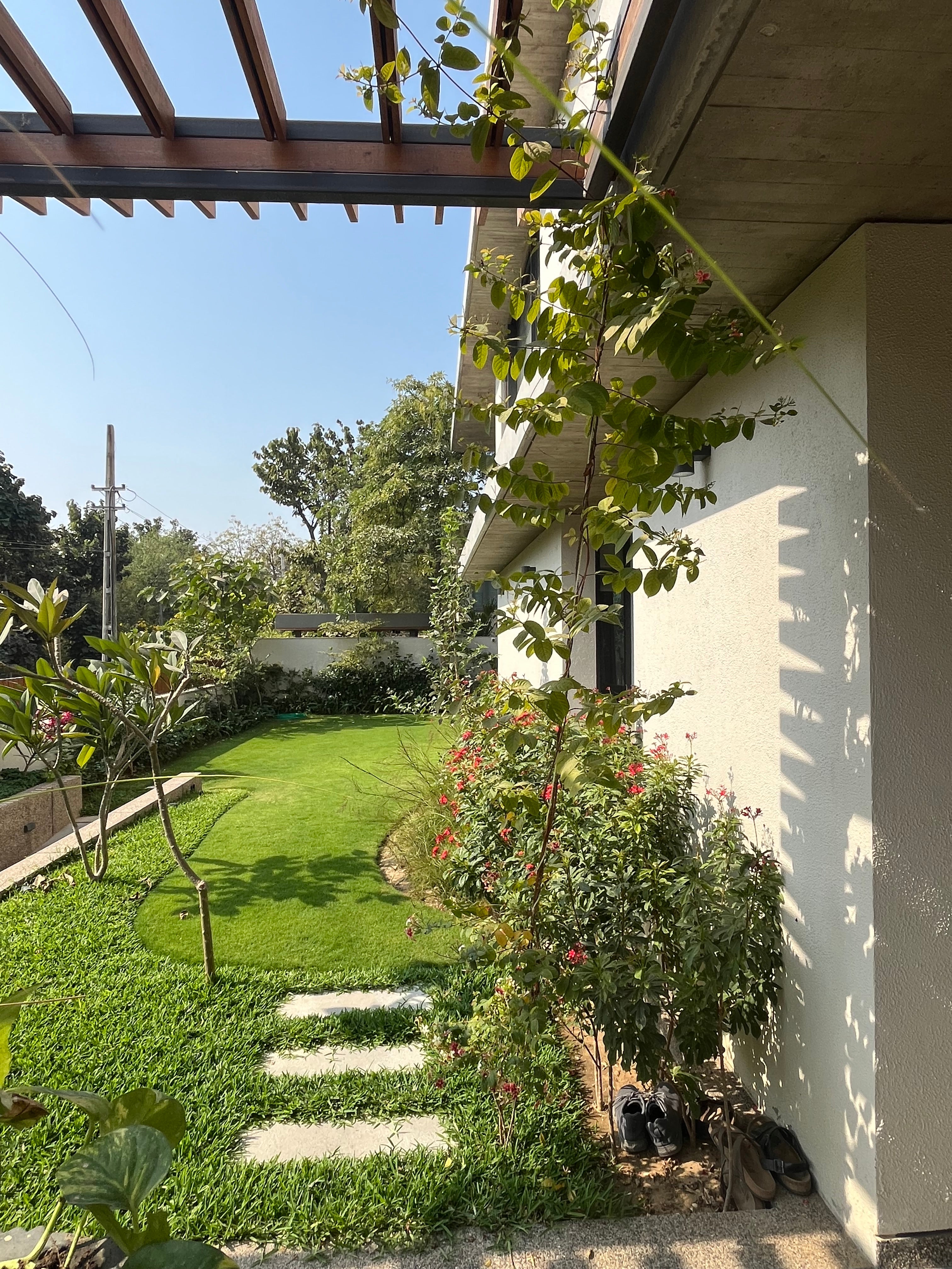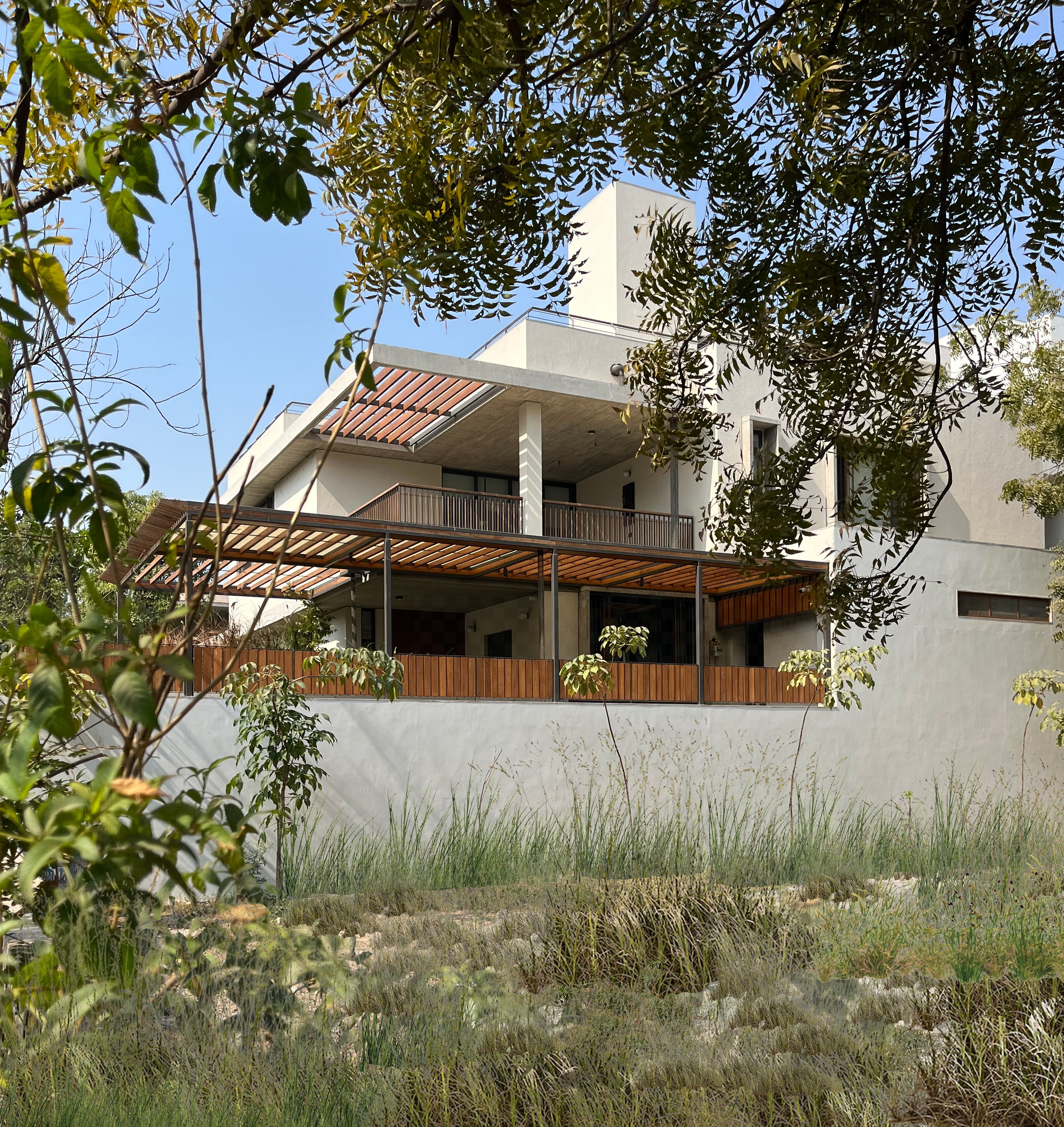 A large urban plot accommodates two independent residences for a semi-joint family across three generations. The seniors occupying the house to the south, the living realms are defined with distinct privacy zones, gardens and social spaces that turn away from each other. A forced dis-association reflected in the plan. However, orientation to the sun and wind flow dictate the architectural strategies for both dwellings. Accessed north-south, the houses are conceptualized as large urban homes with generous proportions of rooms. Continuous living, dining and leisure spaces open towards either the patio or the garden creating seamless extensions along the east-west axis and allowing play of natural light.